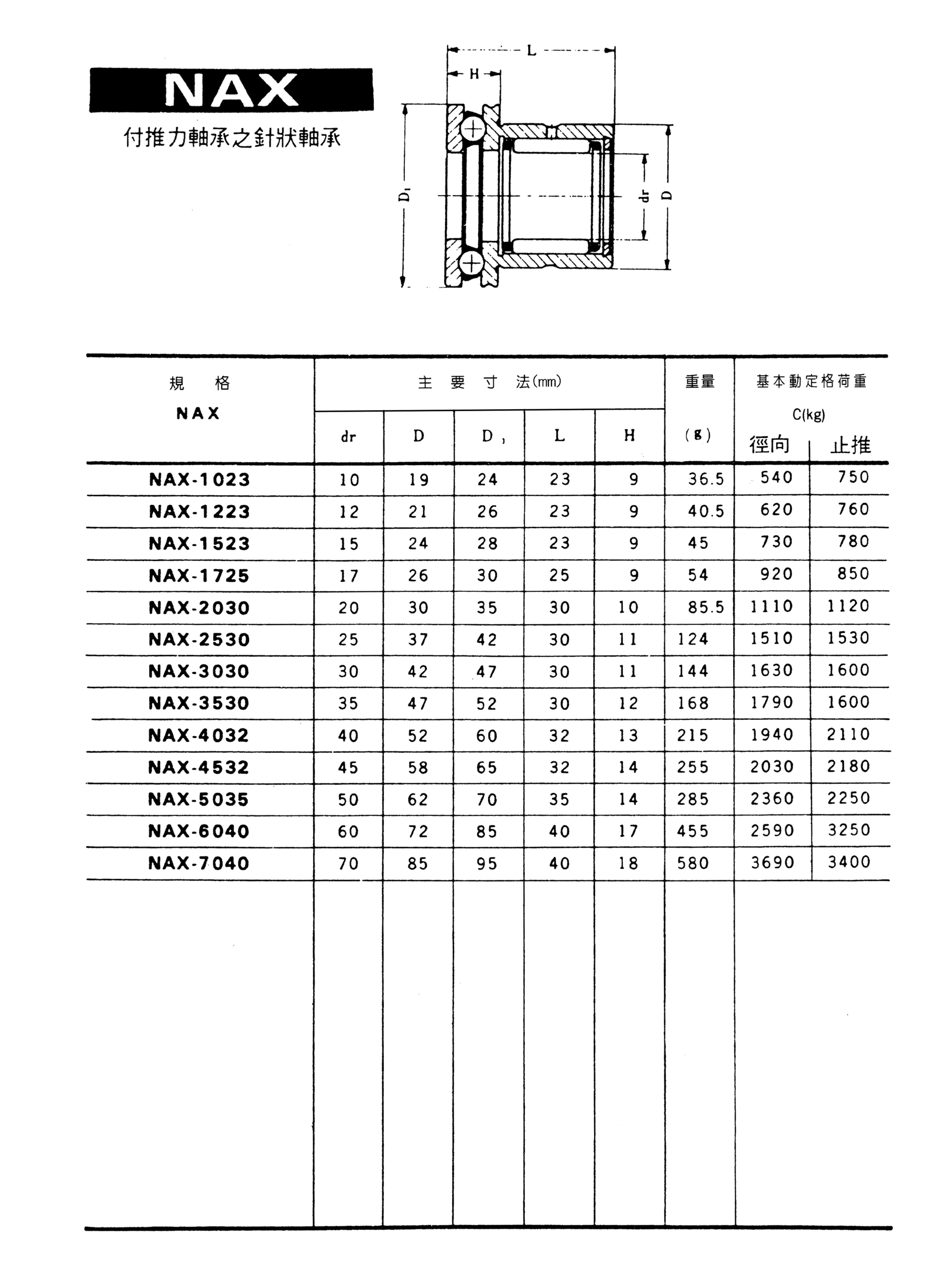 付推力軸承之針狀軸承 NAX